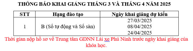Thông báo về việc khai giảng các khóa đào tạo lái xe hạng B